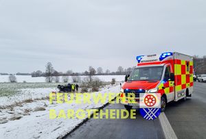 Die Kameraden der FF Hammoor kümmerten sich um den Insassen eines PKW, der von der Fahrbahn abgekommen ist und sich überschlagen hat. Das Fahrzeug kam auf dem Dach liegend auf einem Acker zum liegen. Ersthelfer kümmerten sich vorbildlich um die verletzte Person.