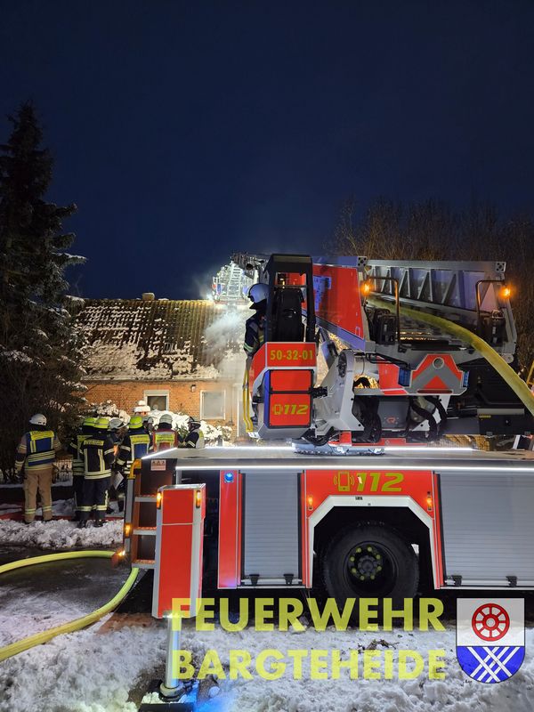 Im Einsatzverlauf öffnete ein Trupp der FF Bargteheide die Dachhaut mittels eines Einreißhakens vom Korb der Drehleiter aus, löschte mit einem D-Strahlrohr Flammen im Bereich des Daches ab und entfernte Dämmmaterial aus dem Dach. Mit einer Rettungssäge wurden innerhalb des Hauses Bereiche der Decke geöffnet.