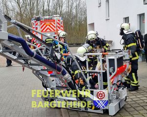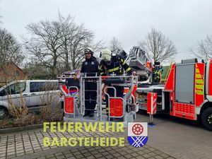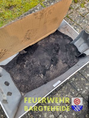 Paralell dazu erkundete ein Trupp das Dach mit dem Schornstein. Mit dabei auch ein Schornsteinfeger. Dieser entschied, dass der Schornstein gekehrt werden muss. Dazu kam unser Schornsteinfegergeschirr in den Einsatz. Nach dem Eintreffen des zuständigen Bezirksschornsteinfegers wurde weiterhin gekehrt und der Ruß in einer Schuttmulde aus der Revisionsöffnung entnommen. Eine Fachfirma erschien noch während der Arbeiten an der Einsatzstelle und begann mit der Überprüfung der Heizungsanlage.