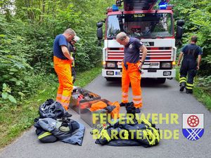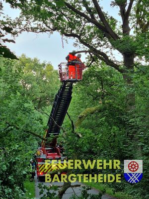 Wir zersägten den Ast von der Drehleiter aus mit einer Kettensäge. Ein Teil des Astes wurde mit der Seilwinde des HLF 50-48-01 gezogen.