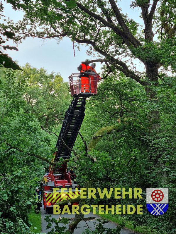 Wir zersägten den Ast von der Drehleiter aus mit einer Kettensäge. Ein Teil des Astes wurde mit der Seilwinde des HLF 50-48-01 gezogen.