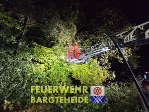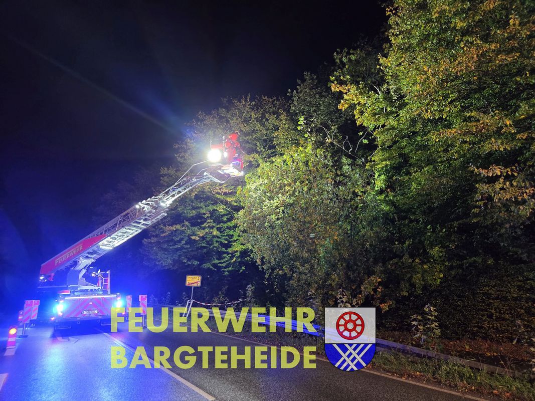 Wir brachten die Drehleiter in Stellung und beseitigten die Gefahrenstelle aus dem Korb der Drehleiter heraus mit einer Akku-Kettensäge.