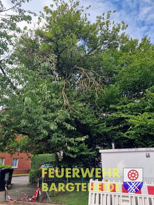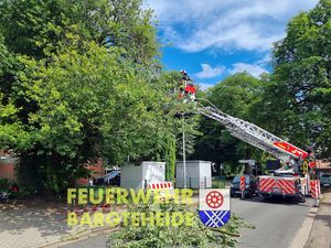 Im Rahmen der Amtshilfe für die Polizei entfernten wir aus dem Korb der Drehleiter heraus einige abgestorbene Äste, die auf den Gehweg zu fallen drohten.