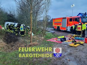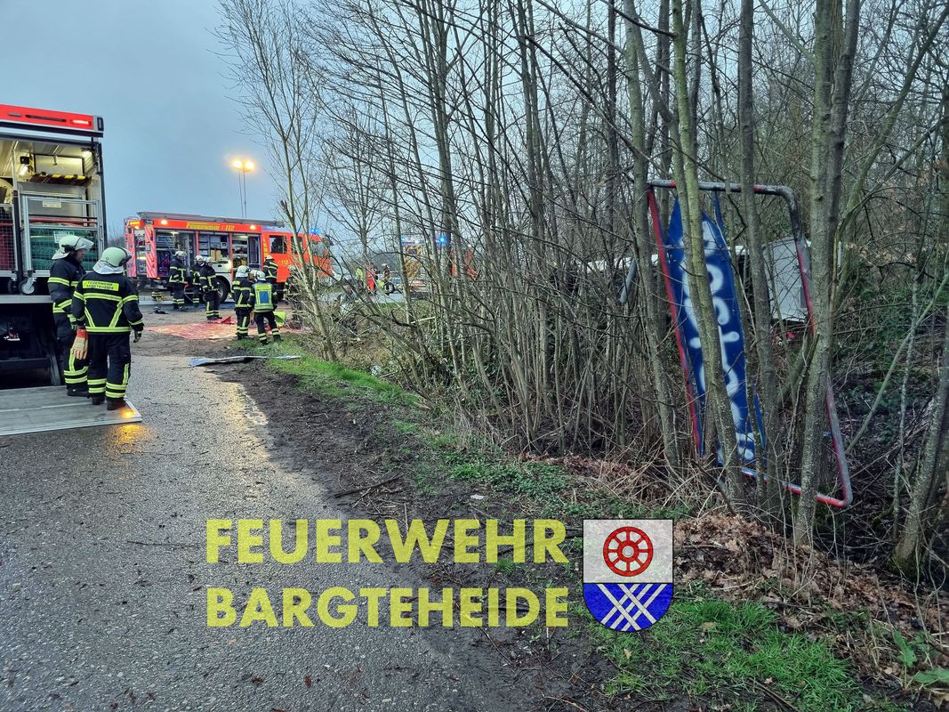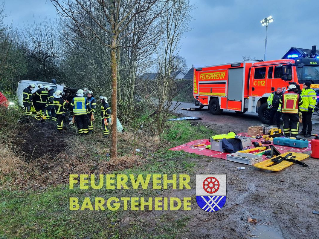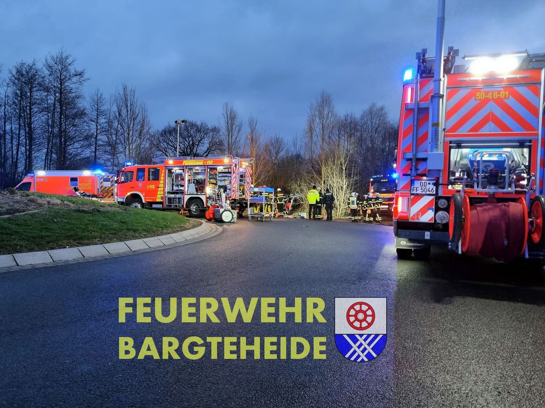 Ein Transporter fuhr über die Verkehrsinsel am Westring und flog im Anschluss über die Kreiselbepflanzung. Danach überschlug sich das Fahrzeug und kam seitlich im Knick zum liegen. Eine Person wurde im Fahrzeug eingeklemmt. Es erfolgte die technische Rettung durch das Fahrerhaus.