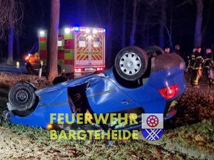 Bei einem Verkehrsunfall auf dem Tremsbütteler Weg kam ein PKW aus unbekannter Ursache von der Fahrbahn ab, überschlug sich und blieb in Dachlage auf einem Acker zum liegen. Die Person im Fahrzeug konnte sich eigenständig befreien und verletzt das Unfallfahrzeug verlassen.