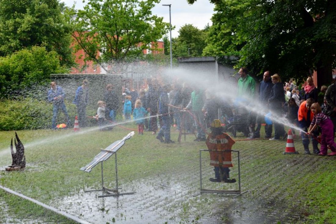 Etwas abseits, in sicherer Entfernung, hatte sich die Jugendfeuerwehr mit ihren Wasserspielen aufgebaut. Hier wurde gelöscht, was die Rohre hergaben.