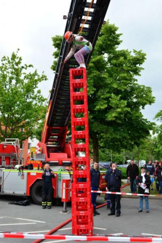 So gab es die „Feuertaufe“, die Riesenhüpfburg des Landesfeuerwehrverbandes zu erklettern, an der Bargteheider Drehleiter, gut gesichert, wurden Getränkekisten gestapelt – 13 Kisten waren der Rekord!