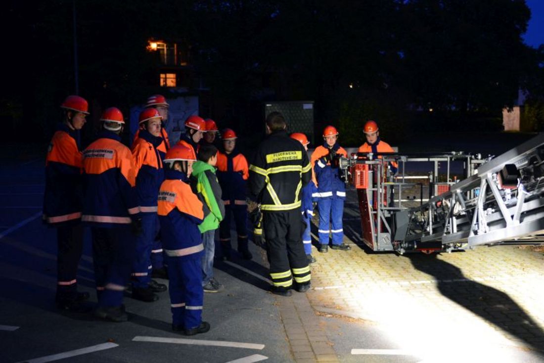 Beeindruckt waren die Kinder als der Leiterpark einmal vollständig ausgefahren wurde – 30 Meter Länge im Nachthimmel und man sieht den Rettungskorb fast gar nicht mehr…