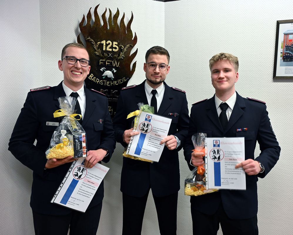 Felix Thoma für 10 Jahre, Fabian Ahlers und Rico Rütjes erhielten das Dienstaltersabzeichen für 20 Jahre Mitgliedschaft.