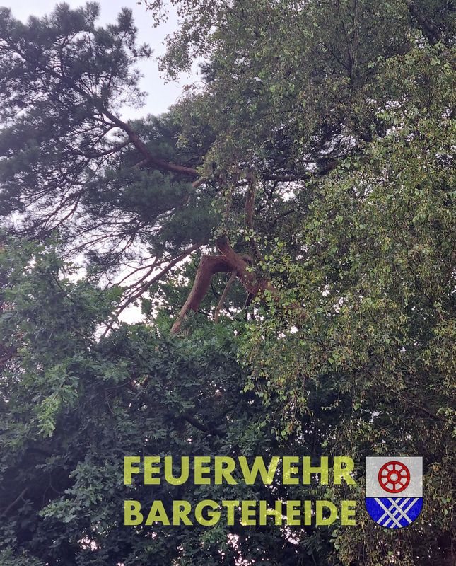 Vermutlich durch einen Blitzschlag in der vergangenen Nacht ist ein dicker Ast einer Kiefer in ca. 8 Meter Höhe abgebrochen und drohte, auf die Strasse zu fallen.