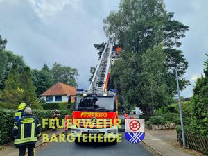 Vom Korb der Drehleiter heraus hat ein Kamerad der FF Bargteheide mehrere Äste abgesägt und damit die Gefahrenstelle beseitigt.