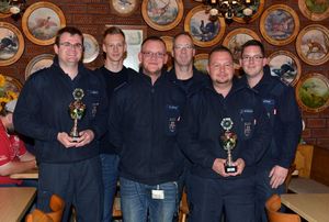 Die Mannschaft "Feuerwehr 1" mit Sebastian, Alexander und Arne erreichte in der Mannschaftswertung den sicheren ersten Platz. Die zweite Mannschaft, Joachim, Thorben und Jens-Uwe, bestand aus ungeübteren Schützen und erreichte einen Platz im hinteren Mittelfeld.